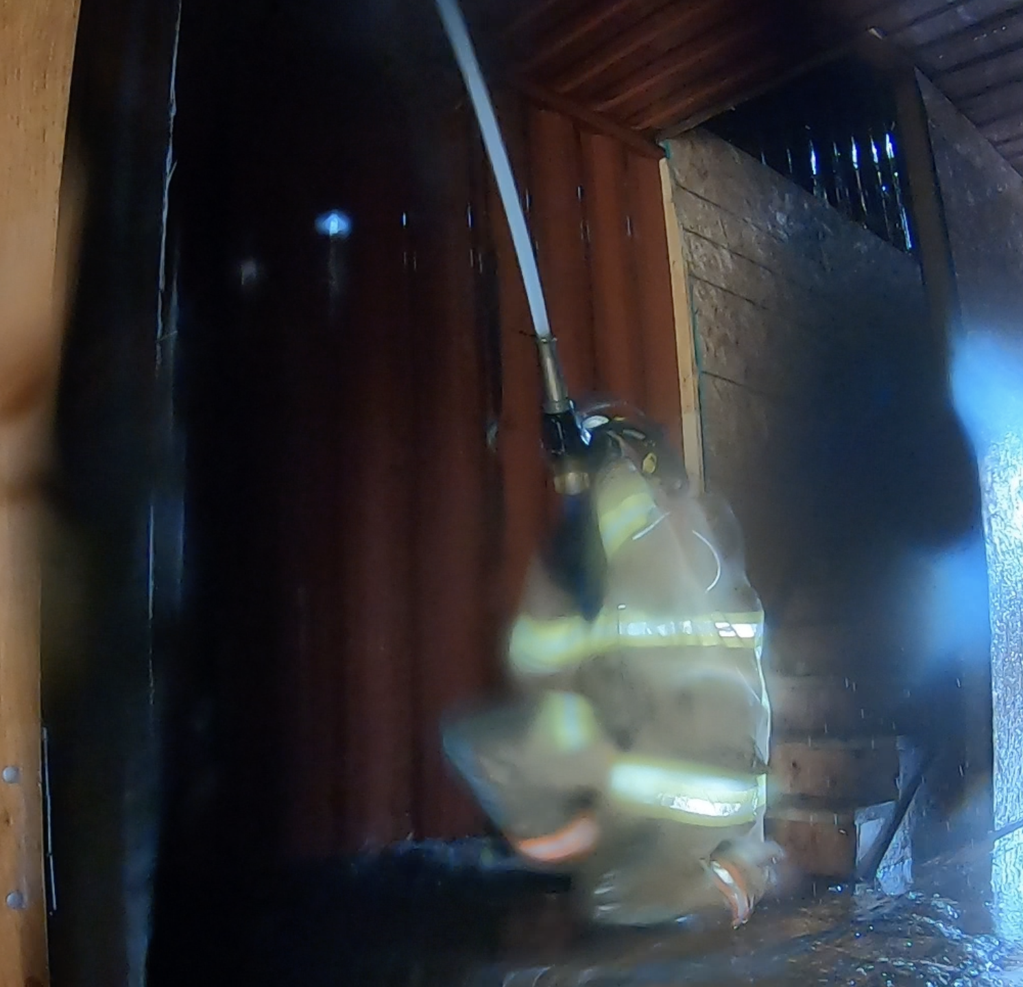 A single firefighter practicing flow and move going into a simulated basement fire using a smoothbore low pressure enozzle